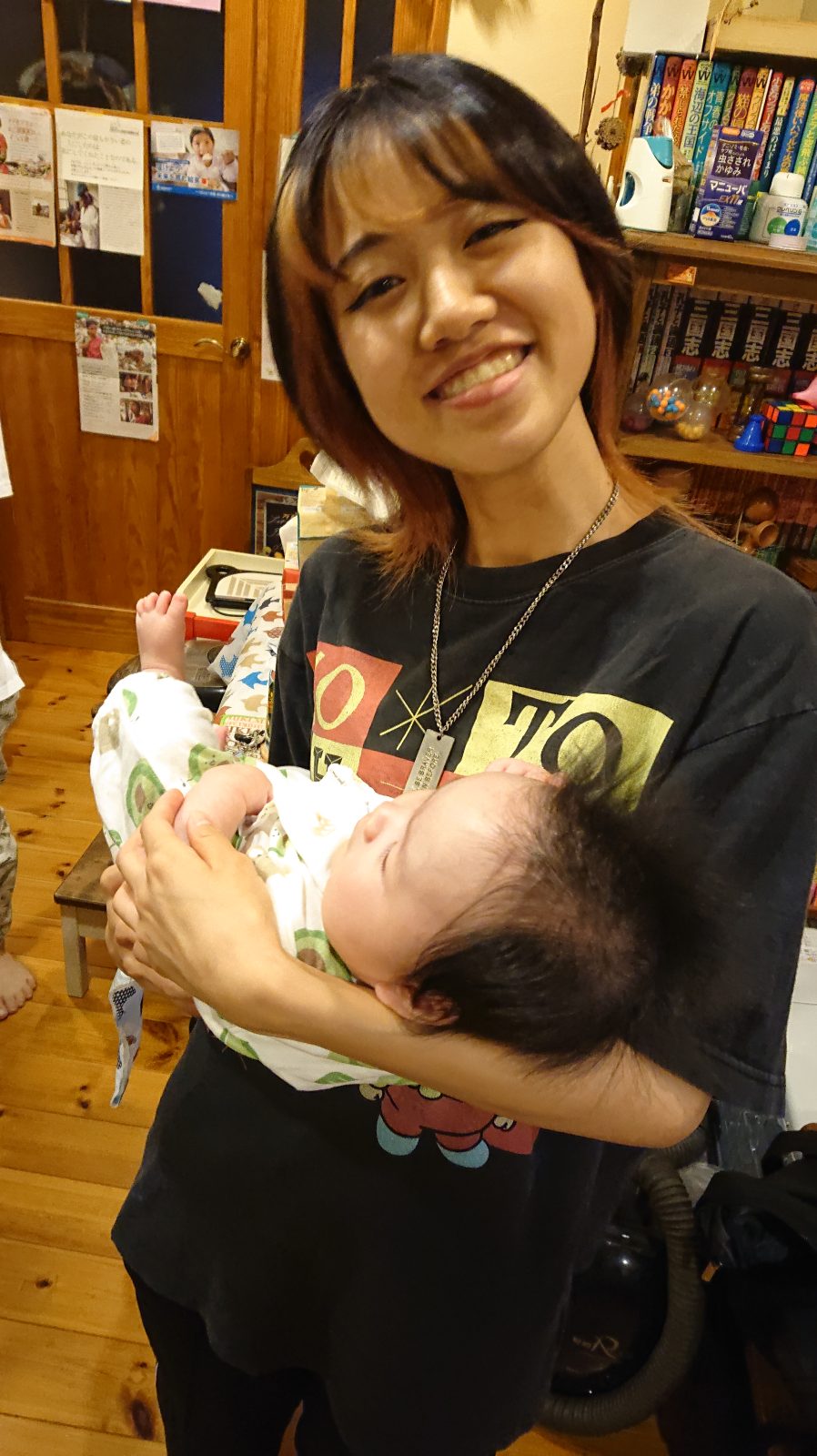 ふさふさの髪に目鼻立ちのくっきりとした顔はママ似かな? 赤ちゃんは、入れ替わりみんなで抱っこしても、全然泣かずにおとなしくしています。そばで見ていた中学生の男の子に、「抱っこしてみる?」と言ったら、「おれ、いいっすよ」と逃げていきました。