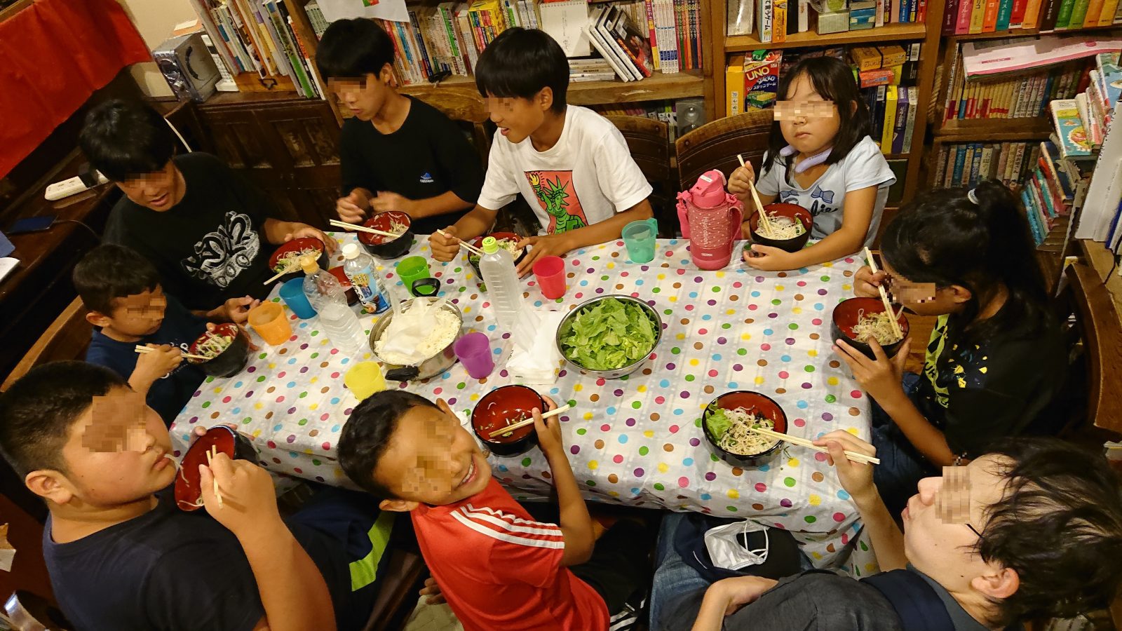みんなでそうめんを食べました。野菜は文楽舎卒業生の田舎から送ってもらったもの、そうめんは寄付でいただいたものです。